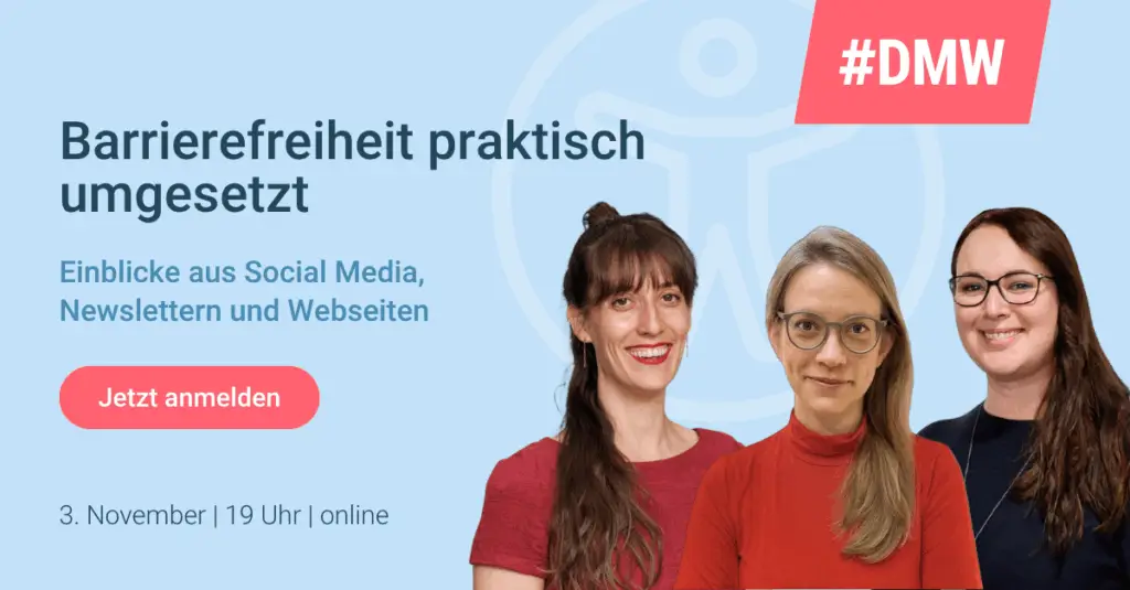 Inklusive Kommunikation – einfach, effektiv und authentisch. Online-Event der #DMW Bremen / Oldenburg mit Einblicken in die Praxis. Wie gelingt es, Social Media Posts, Newsletter und Webseiten wirklich barrierefrei zu gestalten? Barrierefreiheit macht digitale Inhalte für alle zugänglich – klingt selbstverständlich, ist in der Praxis aber oft eine Herausforderung. In diesem Online-Event der Digital Media […]
